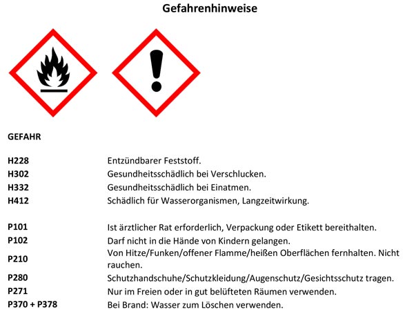 - Achtung: Der Vertrieb und das Überlassen an andere ist nur erlaubt, wenn die kleinste Verpackungseinheit (durch eine feste Umschließung) gegen unbeabsichtigtes Öffnen gesichert ist und die Reibflächen der kleinsten Verpackungseinheit abgedeckt sind.